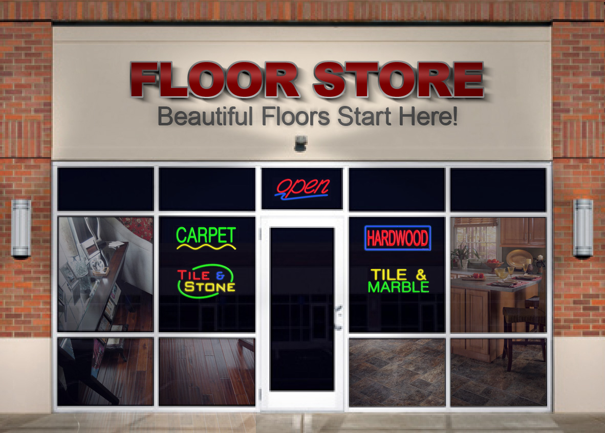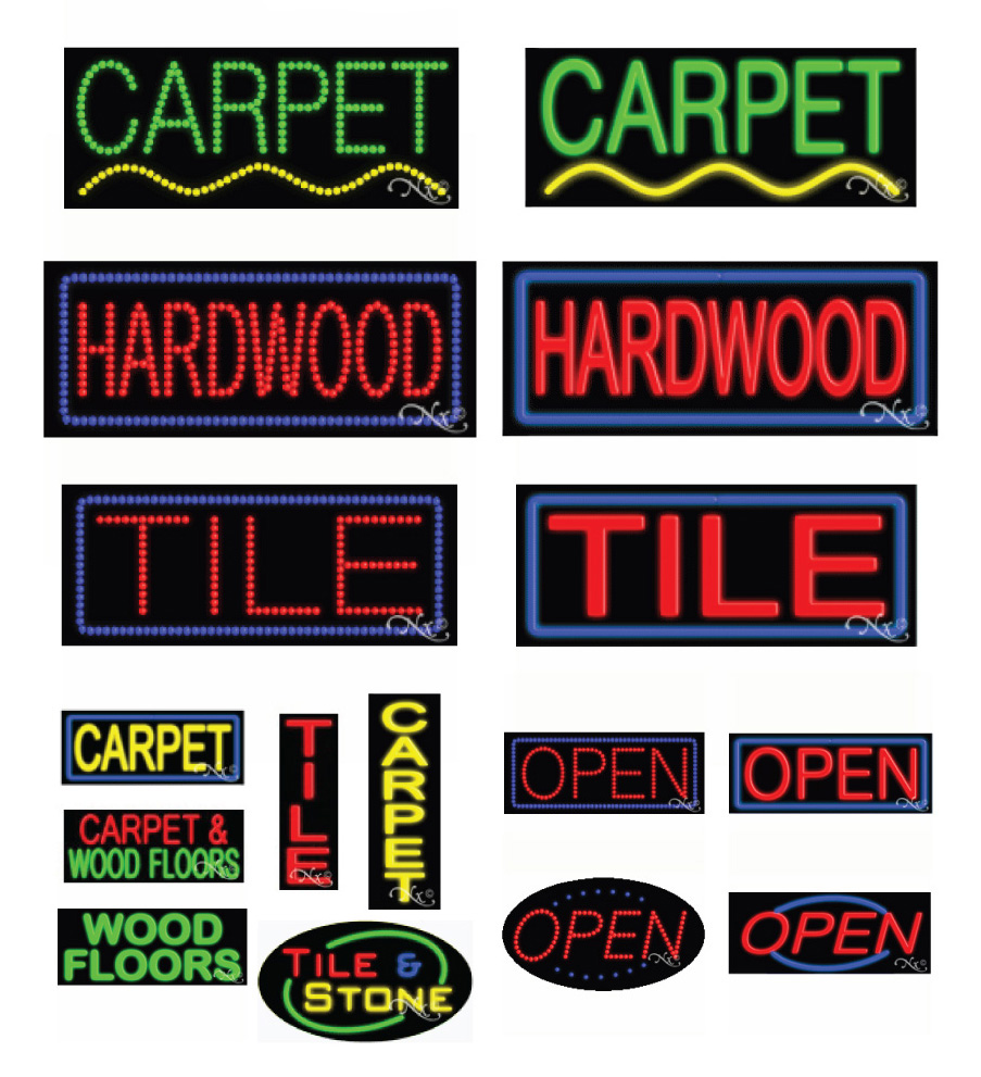 Most stock flooring signs are available in either NEON or power-saving LED. Contact SELLMOREFLOORS for sign details.