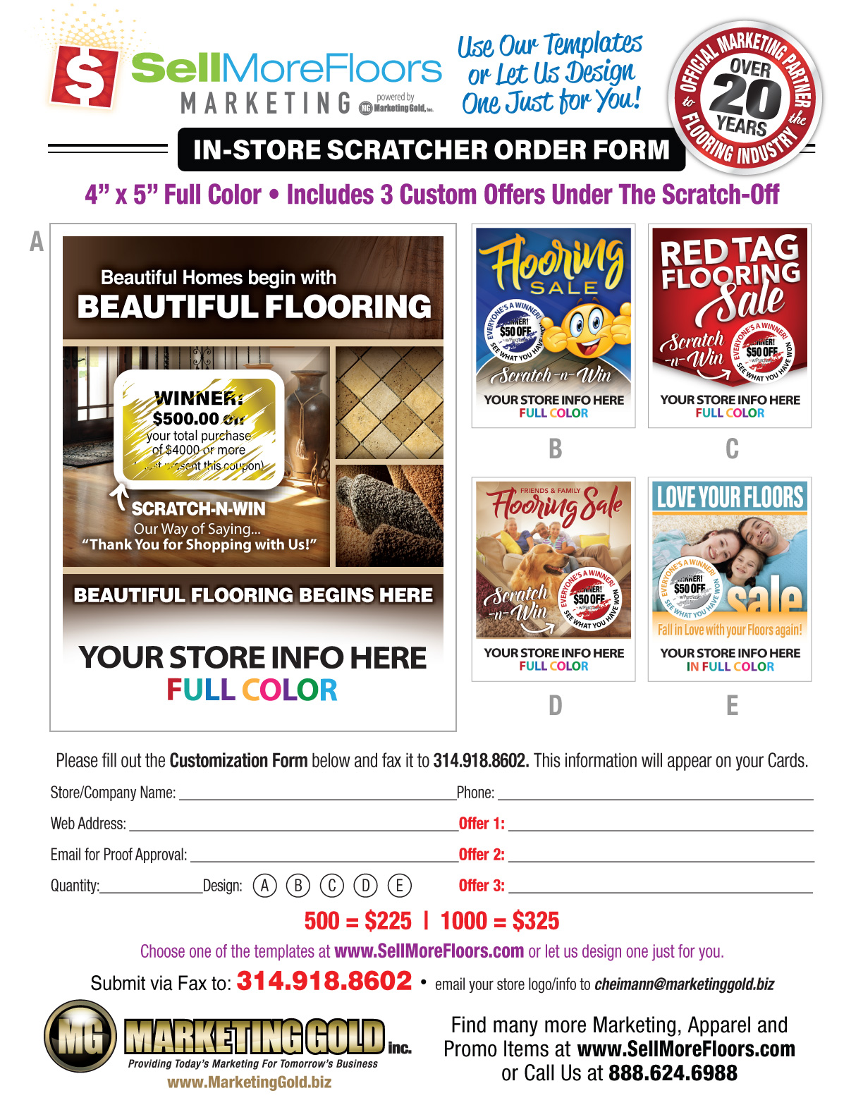 SELLMOREFLOORS gives you the tools to do business to the best of your ability – Our promotional Scratch Off cards are a fun way to interact with your customers, turn MORE shoppers into sales. Take advantage of these fun sales conversion tools today!